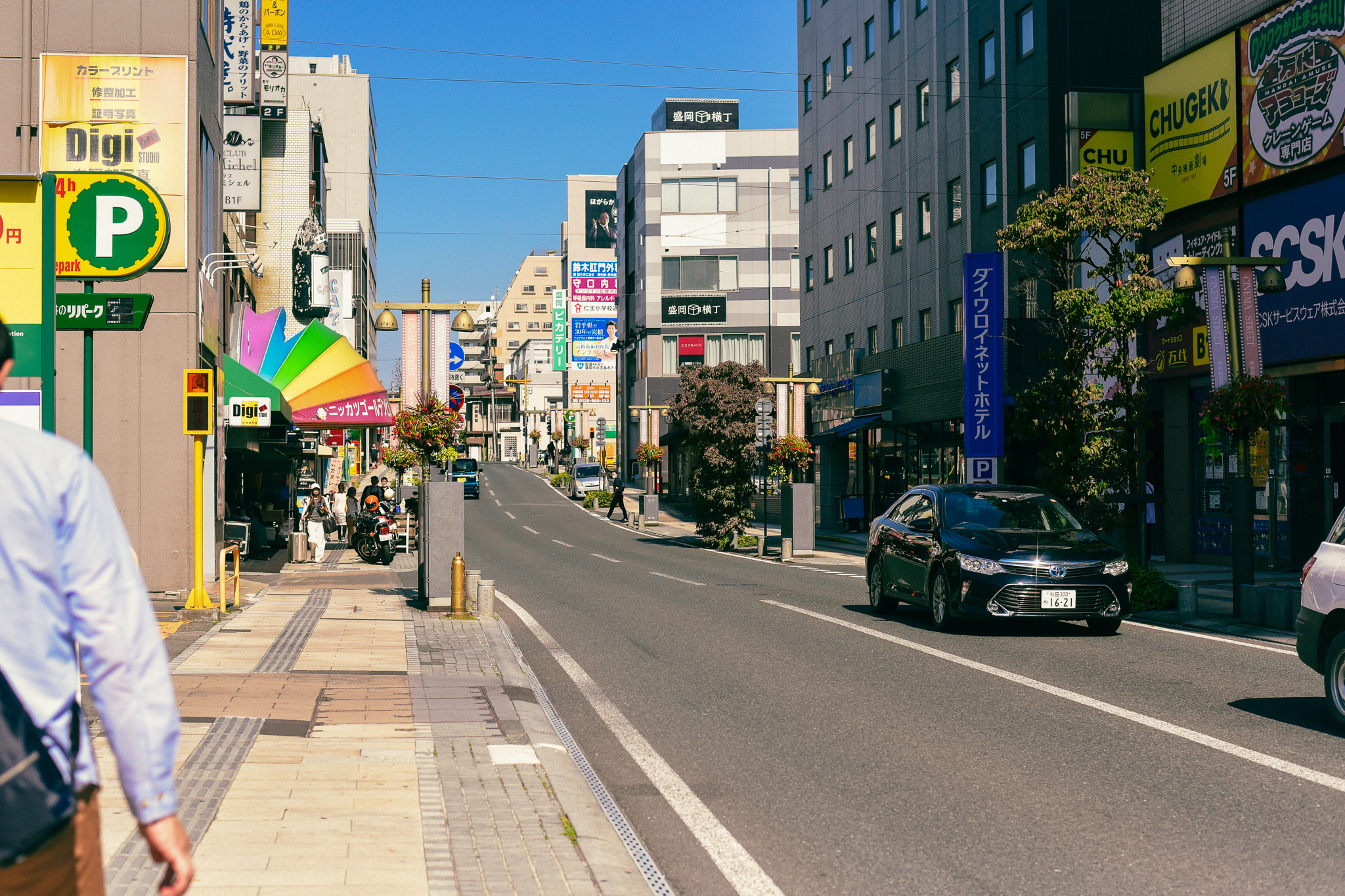 映画館通り、目に入るだけでなんだか幸せレインボー柄の下を通ると、